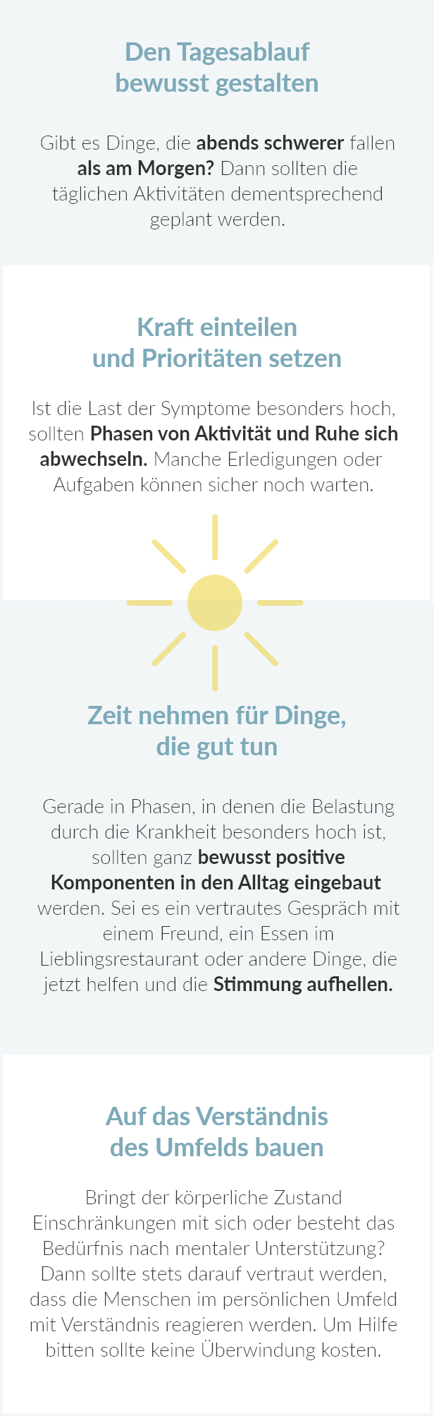 Auswirkungen auf den Alltag hat, denn die Symptome und deren Folgen belasten die Patienten zum